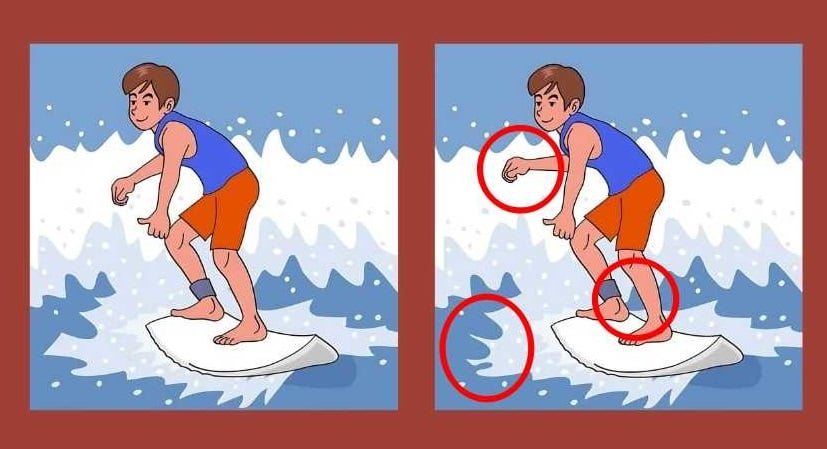 Nella foto vediamo un surfista che conquista le onde su una tavola da surf. A prima vista, potrebbe sembrare che i ragazzi in entrambe le foto siano ugi, ma se si gda da vicino, diventa chiaro che non è così: da qche parte ci sono alcune differenze che rendono le immagini diverse.