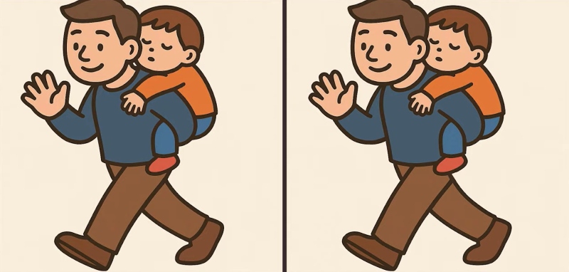 Allora, siete pronti per la prossima sfida? Osservate attentamente le due immagini di un uomo che porta un bambino sulla schiena. A prima vista possono sembrare identiche, ma ci sono 3 piccole differenze. Pensate di riuscire a trovarle tutte in 19 secondi? Provate e mettete alla prova la vostra acutezza visiva!