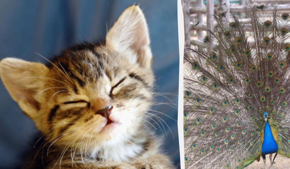 Il gattino era dietro la coda del pavone / collage da foto Moje